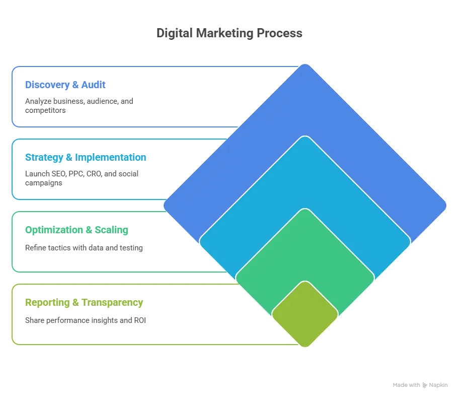 - Discovery & Audit – Analyze your business, audience, and competitors.